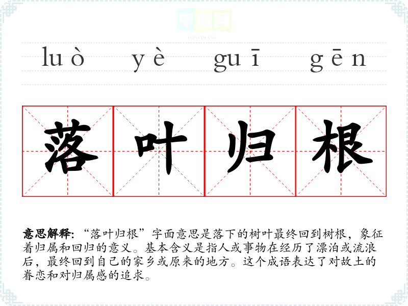 “落叶归根”字面意思是落下的树叶最终回到树根,象征着归属和回归的意义。基本含义是指人或事物在经历了漂泊或流浪后,最终回到自己的家乡或原来的地方。这个成语表达了对故土的眷恋和对归属感的追求。