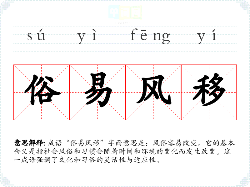 成语“俗易风移”字面意思是:风俗容易改变。它的基本含义是指社会风俗和习惯会随着时间和环境的变化而发生改变。这一成语强调了文化和习俗的灵活性与适应性。