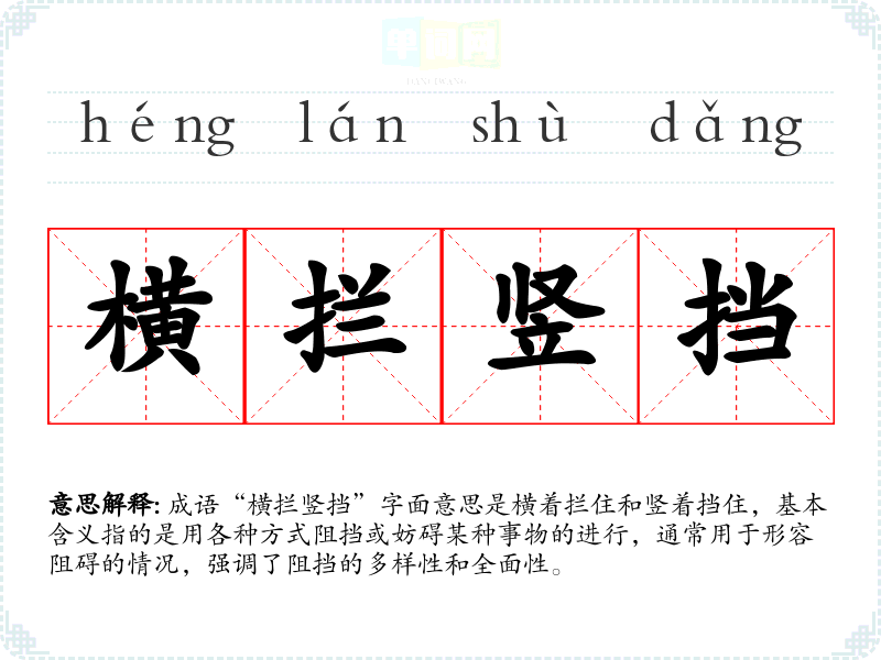 成语“横拦竖挡”字面意思是横着拦住和竖着挡住,基本含义指的是用各种方式阻挡或妨碍某种事物的进行,通常用于形容阻碍的情况,强调了阻挡的多样性和全面性。