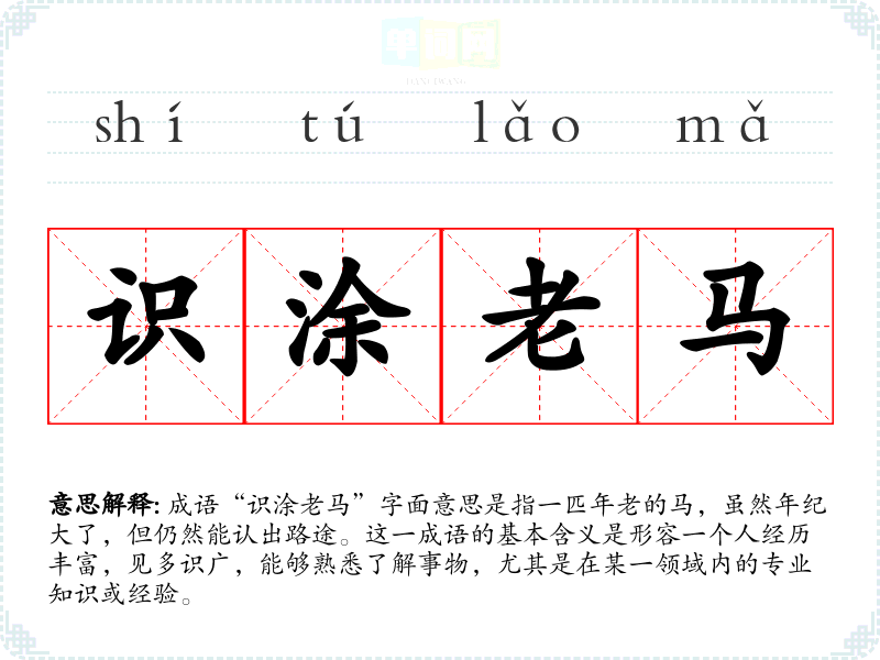 成语“识涂老马”字面意思是指一匹年老的马,虽然年纪大了,但仍然能认出路途。这一成语的基本含义是形容一个人经历丰富,见多识广,能够熟悉了解事物,尤其是在某一领域内的专业知识或经验。