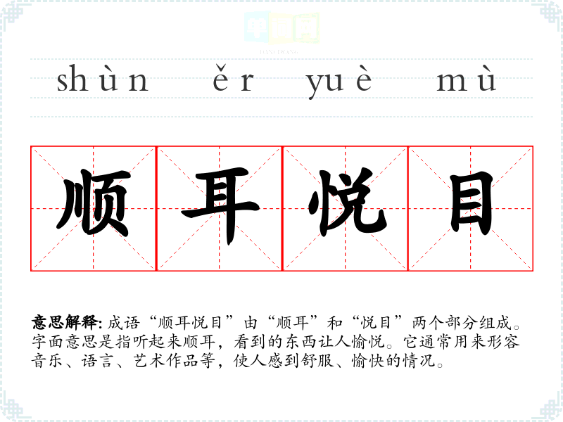 成语“顺耳悦目”由“顺耳”和“悦目”两个部分组成。字面意思是指听起来顺耳,看到的东西让人愉悦。它通常用来形容音乐、语言、艺术作品等,使人感到舒服、愉快的情况。