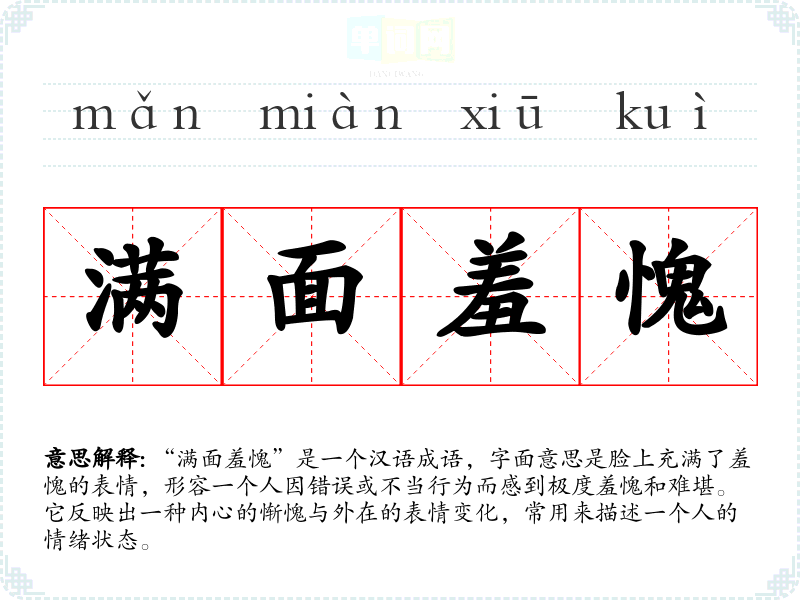 “满面羞愧”是一个汉语成语,字面意思是脸上充满了羞愧的表情,形容一个人因错误或不当行为而感到极度羞愧和难堪。它反映出一种内心的惭愧与外在的表情变化,常用来描述一个人的情绪状态。