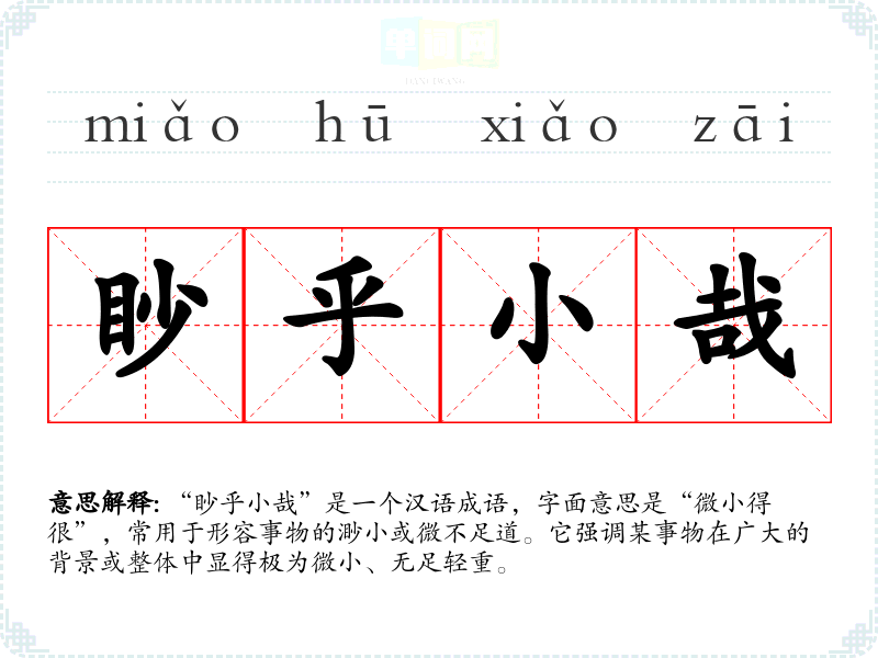“眇乎小哉”是一个汉语成语,字面意思是“微小得很”,常用于形容事物的渺小或微不足道。它强调某事物在广大的背景或整体中显得极为微小、无足轻重。