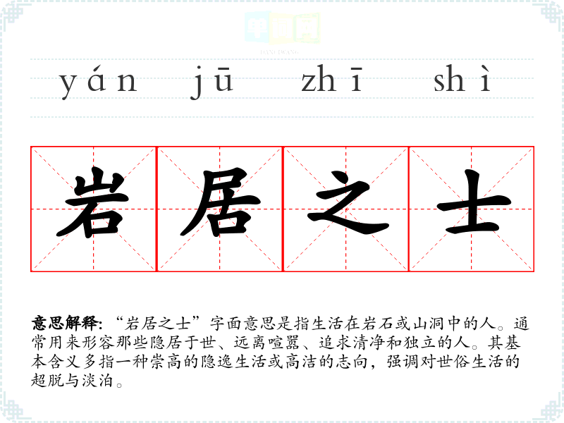 “岩居之士”字面意思是指生活在岩石或山洞中的人。通常用来形容那些隐居于世、远离喧嚣、追求清净和独立的人。其基本含义多指一种崇高的隐逸生活或高洁的志向,强调对世俗生活的超脱与淡泊。
