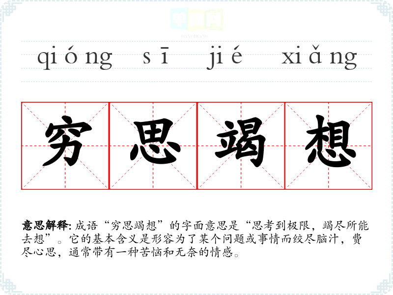成语“穷思竭想”的字面意思是“思考到极限,竭尽所能去想”。它的基本含义是形容为了某个问题或事情而绞尽脑汁,费尽心思,通常带有一种苦恼和无奈的情感。