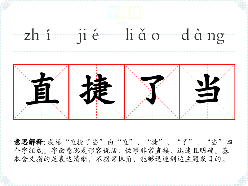成语“直捷了当”由“直”、“捷”、“了”、“当”四个字组成。字面意思是形容说话、做事非常直接、迅速且明确。基本含义指的是表达清晰,不拐弯抹角,能够迅速到达主题或目的。