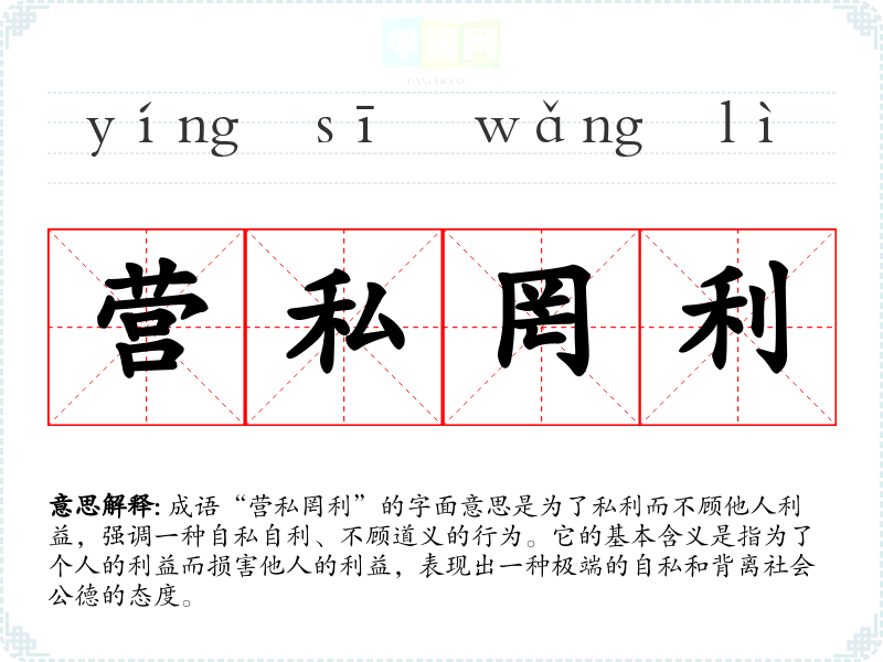 成语“营私罔利”的字面意思是为了私利而不顾他人利益,强调一种自私自利、不顾道义的行为。它的基本含义是指为了个人的利益而损害他人的利益,表现出一种极端的自私和背离社会公德的态度。
