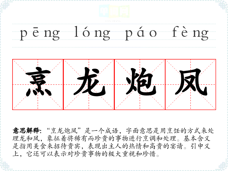 成语“烹龙炮凤”最早见于《太原志》。在古代,龙和凤是象征着权势和尊贵的动物,龙代表着**,凤象征着皇后。此成语的使用背景与古代宴请贵宾、隆重场合的盛大宴席有关,体现了人们对美食的追求和重视。