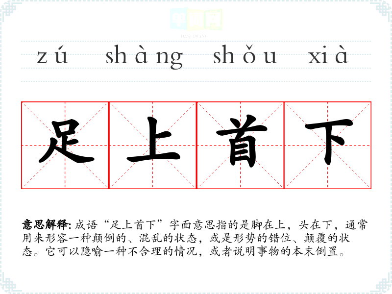 成语“足上首下”字面意思指的是脚在上,头在下,通常用来形容一种颠倒的、混乱的状态,或是形势的错位、颠覆的状态。它可以隐喻一种不合理的情况,或者说明事物的本末倒置。
