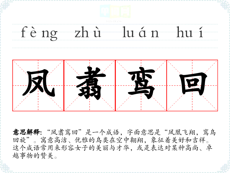 “凤翥鸾回”是一个成语,字面意思是“凤凰飞翔,鸾鸟回旋”。寓意高洁、优雅的鸟类在空中翱翔,象征着美好和吉祥。这个成语常用来形容女子的美丽与才华,或是表达对某种高尚、卓越事物的赞美。