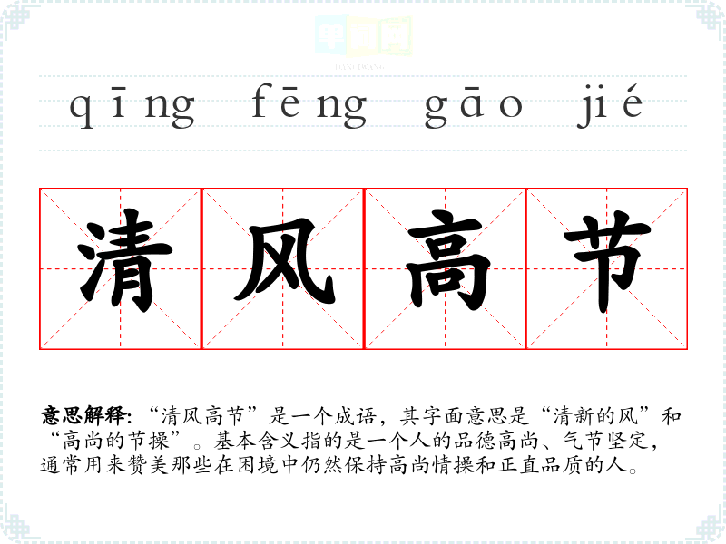 “清风高节”是一个成语,其字面意思是“清新的风”和“高尚的节操”。基本含义指的是一个人的品德高尚、气节坚定,通常用来赞美那些在困境中仍然保持高尚情操和正直品质的人。