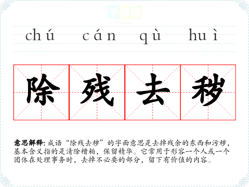 成语“除残去秽”的字面意思是去掉残余的东西和污秽,基本含义指的是清除糟粕,保留精华。它常用于形容一个人或一个团体在处理事务时,去掉不必要的部分,留下有价值的内容。