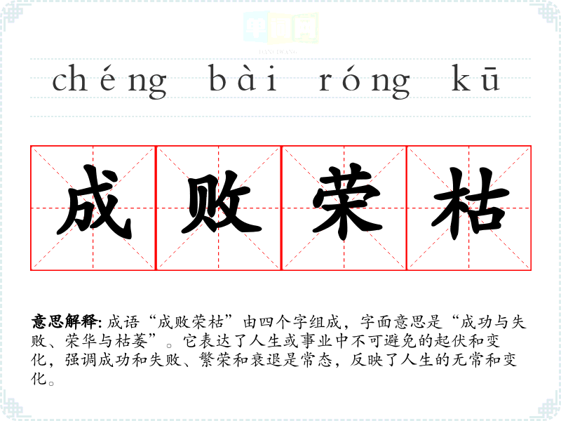 成语“成败荣枯”由四个字组成,字面意思是“成功与失败、荣华与枯萎”。它表达了人生或事业中不可避免的起伏和变化,强调成功和失败、繁荣和衰退是常态,反映了人生的无常和变化。