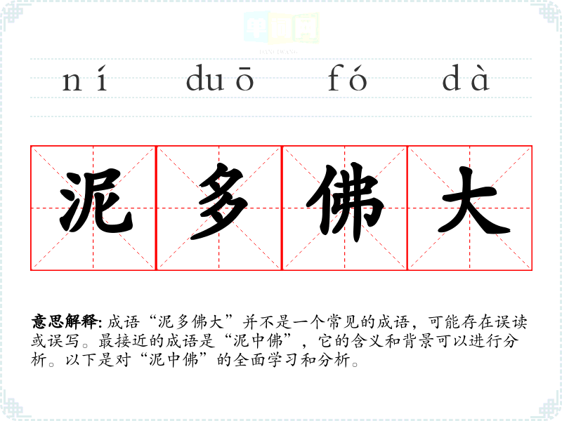 成语“泥多佛大”并不是一个常见的成语,可能存在误读或误写。最接近的成语是“泥中佛”,它的含义和背景可以进行分析。以下是对“泥中佛”的全面学*和分析。