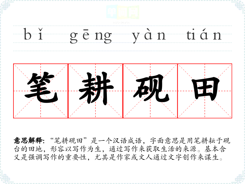 “笔耕砚田”是一个汉语成语,字面意思是用笔耕耘于砚台的田地,形容以写作为生,通过写作来获取生活的来源。基本含义是强调写作的重要性,尤其是作家或文人通过文字创作来谋生。