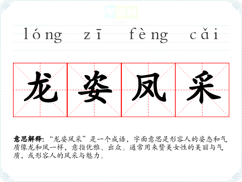 “龙姿凤采”是一个成语,字面意思是形容人的姿态和气质像龙和凤一样,意指优雅、出众。通常用来赞美女性的美丽与气质,或形容人的风采与魅力。