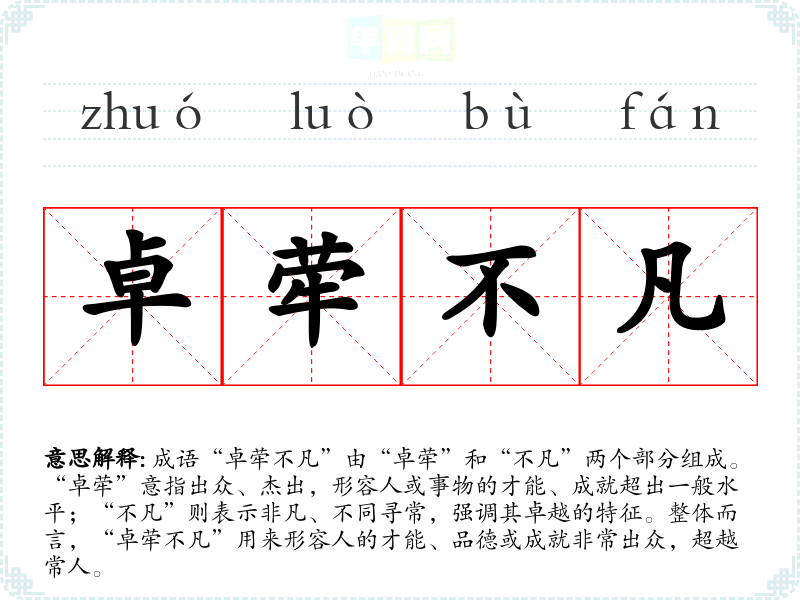成语“卓荦不凡”由“卓荦”和“不凡”两个部分组成。“卓荦”意指出众、杰出,形容人或事物的才能、成就超出一般水平;“不凡”则表示非凡、不同寻常,强调其卓越的特征。整体而言,“卓荦不凡”用来形容人的才能、品德或成就非常出众,超越常人。