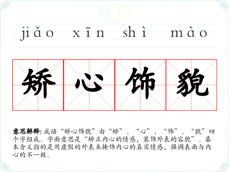 成语“矫心饰貌”由“矫”、“心”、“饰”、“貌”四个字组成。字面意思是“矫正内心的情感,装饰外表的容貌”。基本含义指的是用虚假的外表来掩饰内心的真实情感,强调表面与内心的不一致。