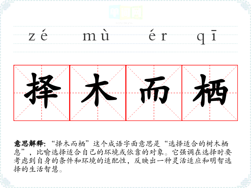 “择木而栖”这个成语字面意思是“选择适合的树木栖息”,比喻选择适合自己的环境或依靠的对象。它强调在选择时要考虑到自身的条件和环境的适配性,反映出一种灵活适应和明智选择的生活智慧。