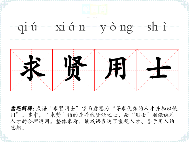 “求贤用士”让人联想到智慧和远见,表现出一种积极向上的态度。在现代职场中,这一成语激励人们重视团队合作和人才的培养,促进交流与合作的氛围。