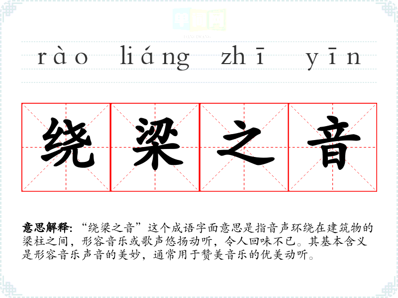 “绕梁之音”这个成语字面意思是指音声环绕在建筑物的梁柱之间,形容音乐或歌声悠扬动听,令人回味不已。其基本含义是形容音乐声音的美妙,通常用于赞美音乐的优美动听。