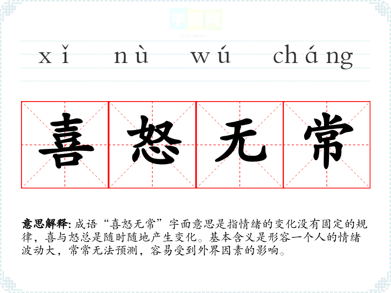 成语“喜怒无常”字面意思是指情绪的变化没有固定的规律,喜与怒总是随时随地产生变化。基本含义是形容一个人的情绪波动大,常常无法预测,容易受到外界因素的影响。