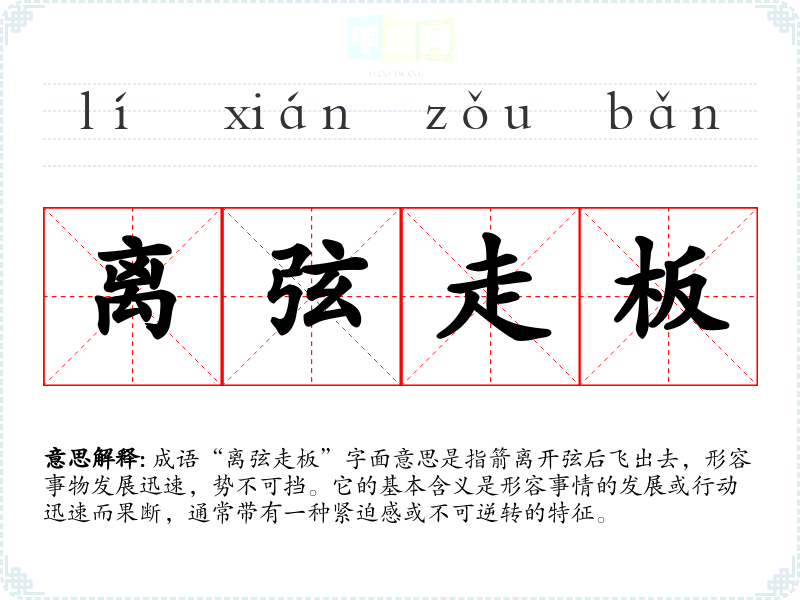成语“离弦走板”字面意思是指箭离开弦后飞出去,形容事物发展迅速,势不可挡。它的基本含义是形容事情的发展或行动迅速而果断,通常带有一种紧迫感或不可逆转的特征。