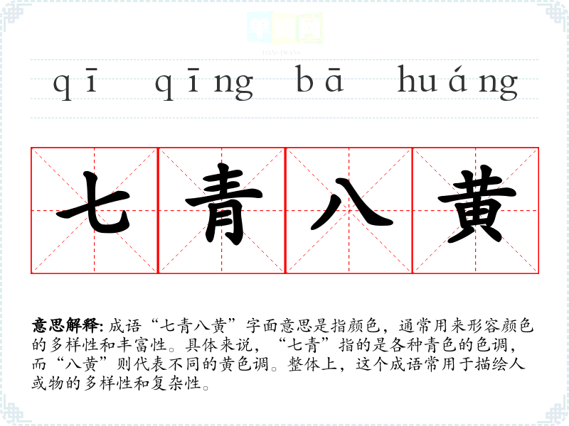成语“七青八黄”字面意思是指颜色,通常用来形容颜色的多样性和丰富性。具体来说,“七青”指的是各种青色的色调,而“八黄”则代表不同的黄色调。整体上,这个成语常用于描绘人或物的多样性和复杂性。