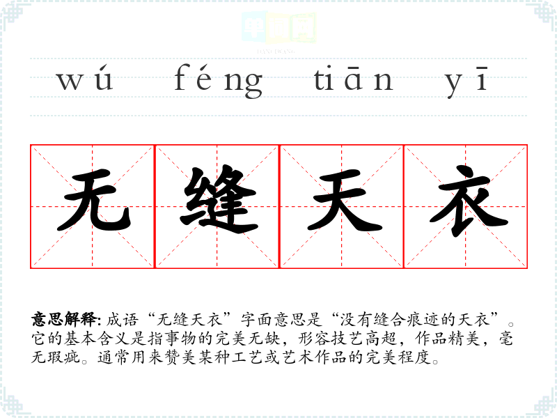 成语“无缝天衣”字面意思是“没有缝合痕迹的天衣”。它的基本含义是指事物的完美无缺,形容技艺高超,作品精美,毫无瑕疵。通常用来赞美某种工艺或艺术作品的完美程度。