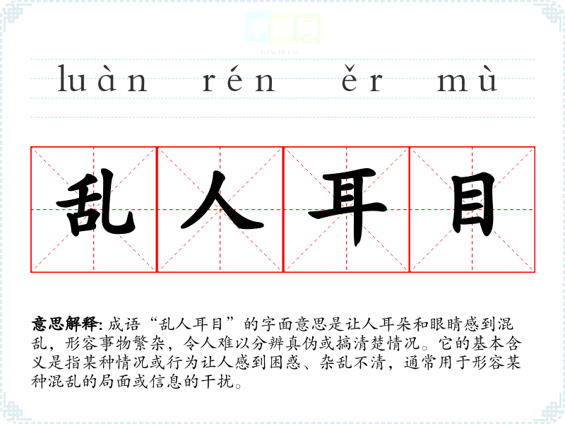 成语“乱人耳目”的字面意思是让人耳朵和眼睛感到混乱,形容事物繁杂,令人难以分辨真伪或搞清楚情况。它的基本含义是指某种情况或行为让人感到困惑、杂乱不清,通常用于形容某种混乱的局面或信息的干扰。