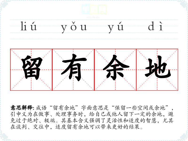成语“留有余地”字面意思是“保留一些空间或余地”,引申义为在做事、处理事务时,给自己或他人留下一定的余地,避免过于绝对、极端。其基本含义强调了灵活性和适度的智慧,尤其在谈判、交往中,适度留有余地可以带来更好的结果。