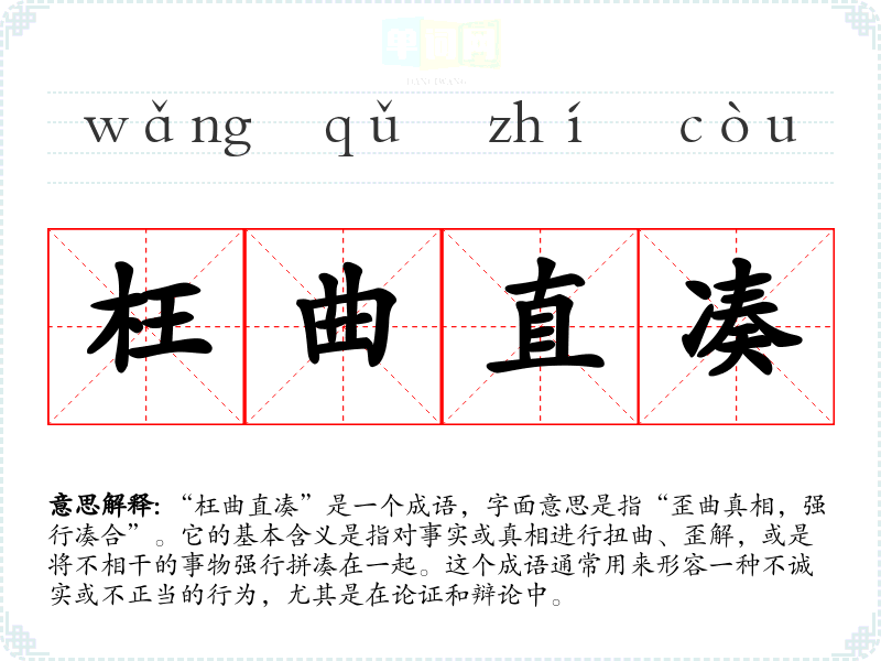 “枉曲直凑”是一个成语,字面意思是指“歪曲真相,强行凑合”。它的基本含义是指对事实或真相进行扭曲、歪解,或是将不相干的事物强行拼凑在一起。这个成语通常用来形容一种不诚实或不正当的行为,尤其是在论证和辩论中。