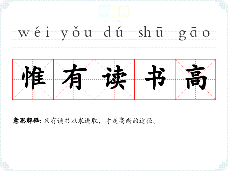 | 书读百遍,其意自见 | 见:显露。指书读的次数多了,其意思就自然显露出来了。 |