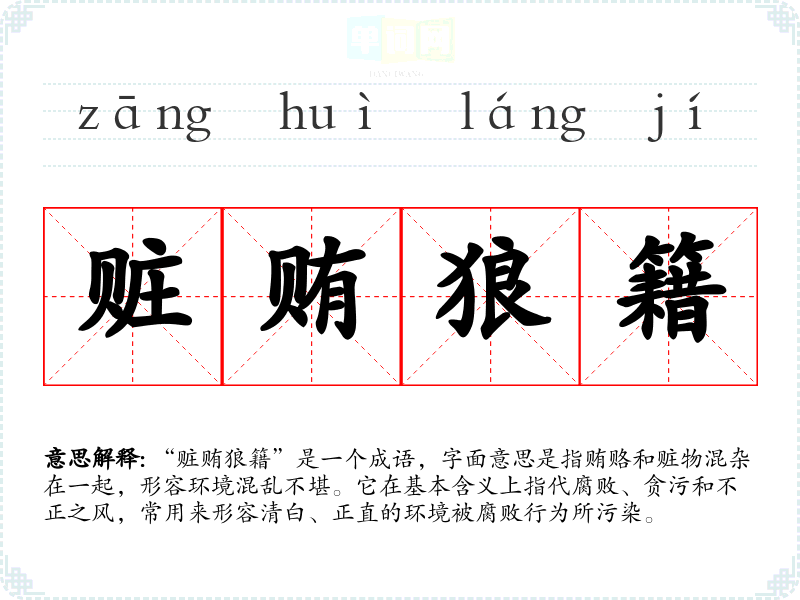 “赃贿狼籍”是一个成语,字面意思是指贿赂和赃物混杂在一起,形容环境混乱不堪。它在基本含义上指代腐败、贪污和不正之风,常用来形容清白、正直的环境被腐败行为所污染。
