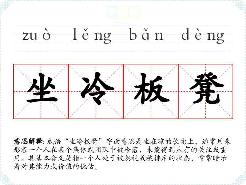 成语“坐冷板凳”字面意思是坐在凉的长凳上,通常用来形容一个人在某个集体或团队中被冷落,未能得到应有的关注或重用。其基本含义是指一个人处于被忽视或被排斥的状态,常常暗示着对其能力或价值的低估。