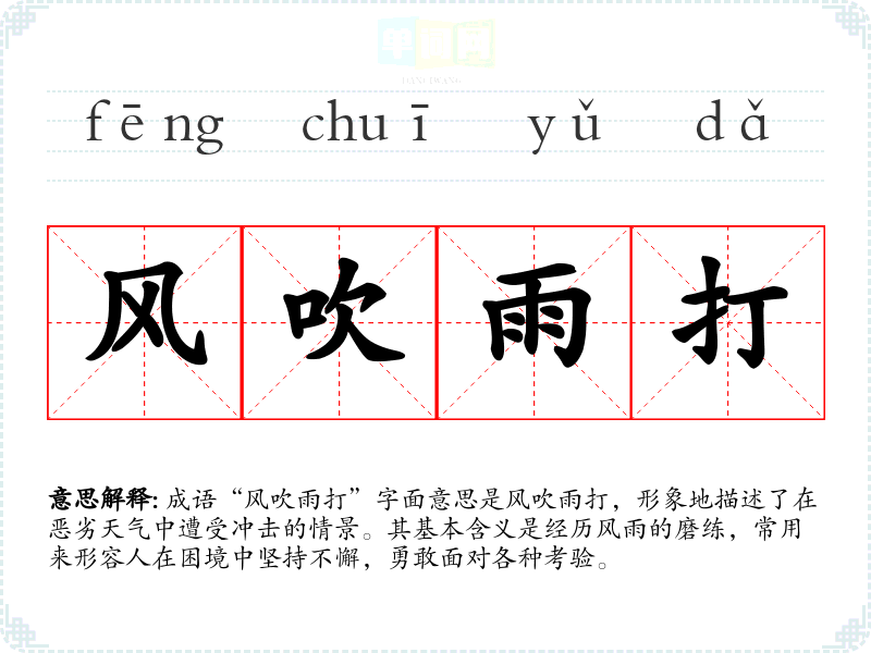 在生活中,我曾经历过一段艰难的时光,常常感到疲惫和无助。然而,正是这样的风吹雨打让我成长了许多,学会了如何去面对挑战。我也经常用这个成语鼓励自己和朋友,提醒我们要勇敢地走下去。