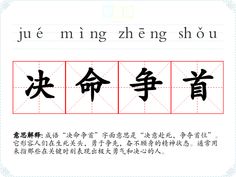 成语“决命争首”字面意思是“决意赴死,争夺首位”。它形容人们在生死关头,勇于争先,奋不顾身的精神状态。通常用来指那些在关键时刻表现出极大勇气和决心的人。