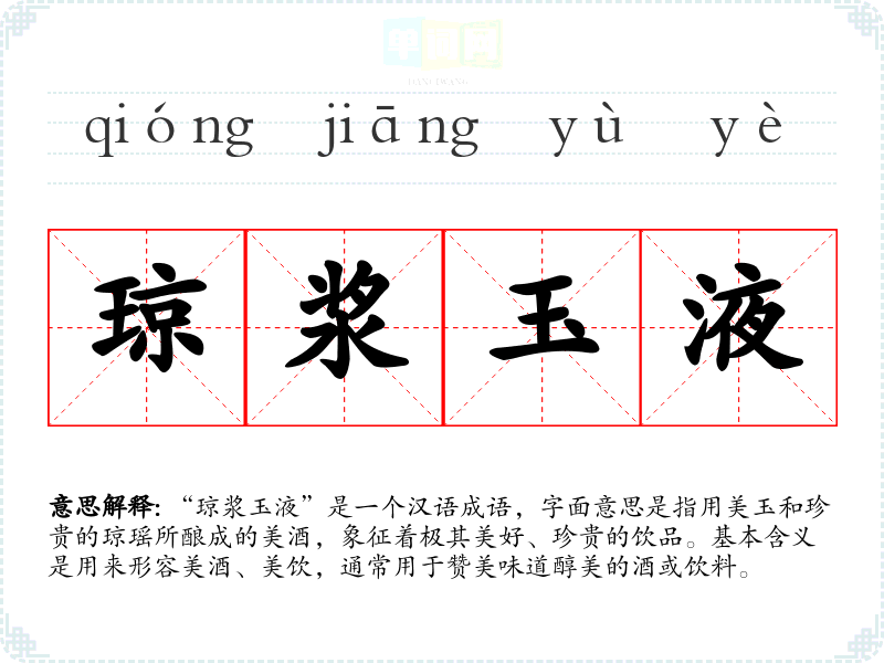 - 日常对话:在朋友聚会时,可以用“琼浆玉液”形容酒的美味,增添气氛。