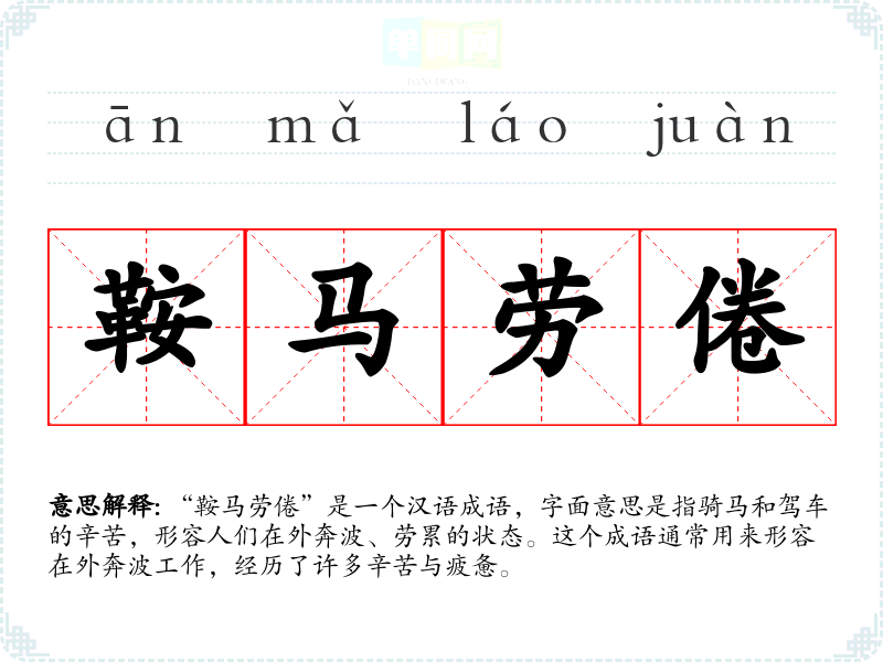 “鞍马劳倦”是一个汉语成语,字面意思是指骑马和驾车的辛苦,形容人们在外奔波、劳累的状态。这个成语通常用来形容在外奔波工作,经历了许多辛苦与疲惫。