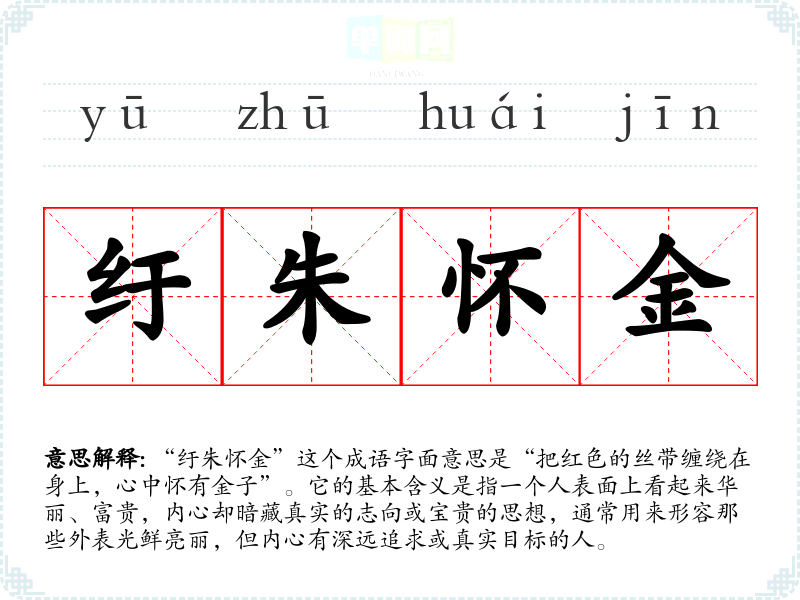 “纡朱怀金”这个成语字面意思是“把红色的丝带缠绕在身上,心中怀有金子”。它的基本含义是指一个人表面上看起来华丽、富贵,内心却暗藏真实的志向或宝贵的思想,通常用来形容那些外表光鲜亮丽,但内心有深远追求或真实目标的人。