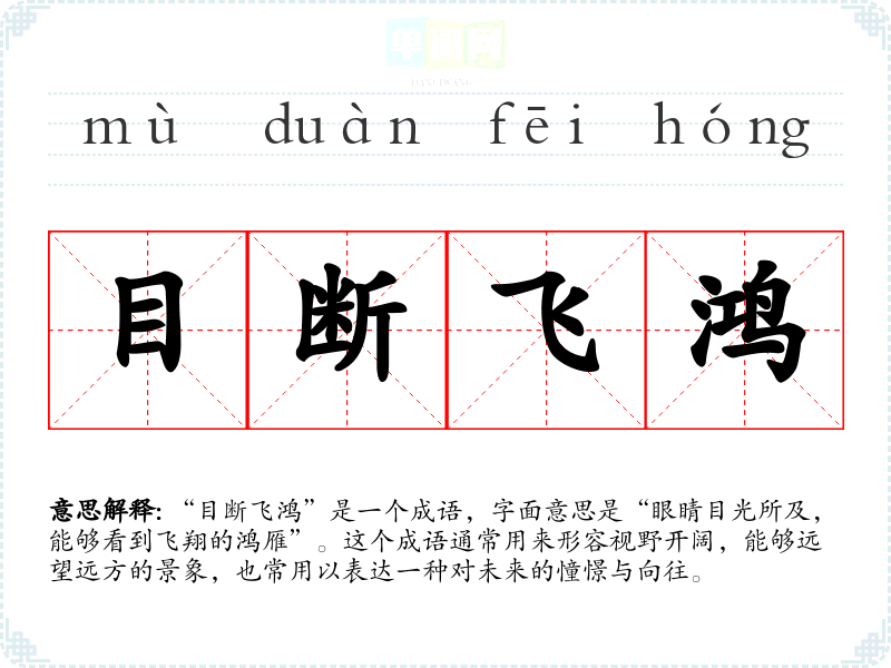 “目断飞鸿”是一个成语,字面意思是“眼睛目光所及,能够看到飞翔的鸿雁”。这个成语通常用来形容视野开阔,能够远望远方的景象,也常用以表达一种对未来的憧憬与向往。