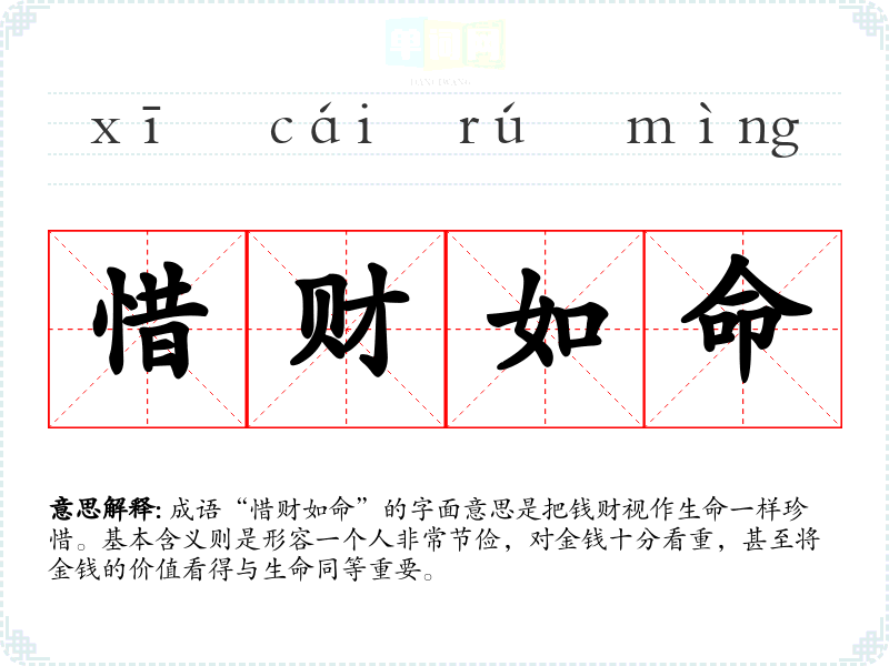 成语“惜财如命”的字面意思是把钱财视作生命一样珍惜。基本含义则是形容一个人非常节俭,对金钱十分看重,甚至将金钱的价值看得与生命同等重要。