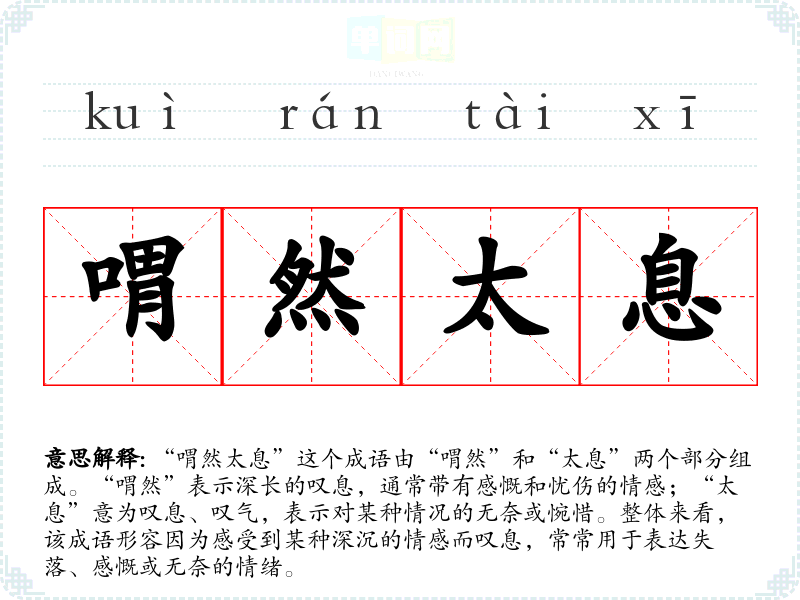“喟然太息”这个成语由“喟然”和“太息”两个部分组成。“喟然”表示深长的叹息,通常带有感慨和忧伤的情感;“太息”意为叹息、叹气,表示对某种情况的无奈或惋惜。整体来看,该成语形容因为感受到某种深沉的情感而叹息,常常用于表达失落、感慨或无奈的情绪。