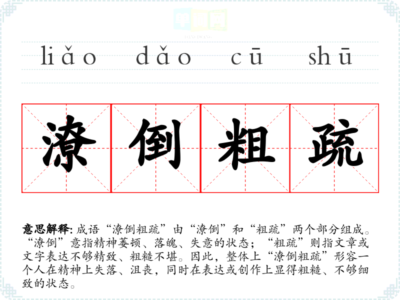 成语“潦倒粗疏”由“潦倒”和“粗疏”两个部分组成。“潦倒”意指精神萎顿、落魄、失意的状态;“粗疏”则指文章或文字表达不够精致、粗糙不堪。因此,整体上“潦倒粗疏”形容一个人在精神上失落、沮丧,同时在表达或创作上显得粗糙、不够细致的状态。