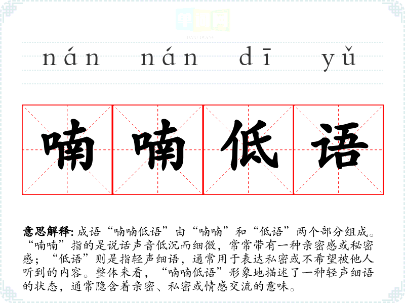 成语“喃喃低语”由“喃喃”和“低语”两个部分组成。“喃喃”指的是说话声音低沉而细微,常常带有一种亲密感或秘密感;“低语”则是指轻声细语,通常用于表达私密或不希望被他人听到的内容。整体来看,“喃喃低语”形象地描述了一种轻声细语的状态,通常隐含着亲密、私密或情感交流的意味。