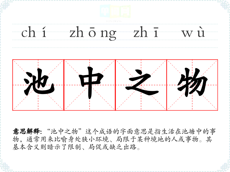 “池中之物”这个成语的字面意思是指生活在池塘中的事物,通常用来比喻身处狭小环境、局限于某种境地的人或事物。其基本含义则暗示了限制、局促或缺乏出路。