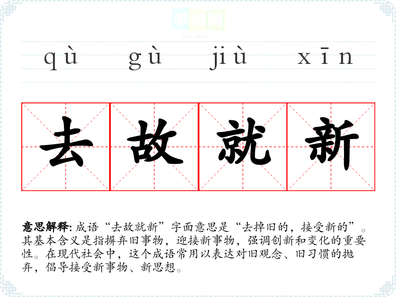 “去故就新”带给人一种积极向上的情感反应,鼓励人们勇敢地面对变化。它让我联想到个人成长和转变的过程,提醒我不应因过去的经历而停滞不前,而是要时刻保持开放的心态,去迎接新的挑战和机遇。