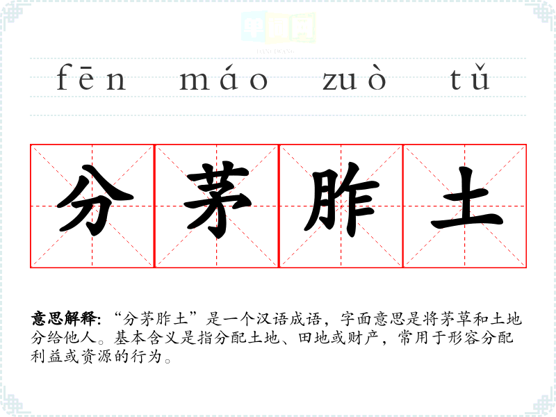 “分茅胙土”是一个汉语成语,字面意思是将茅草和土地分给他人。基本含义是指分配土地、田地或财产,常用于形容分配利益或资源的行为。