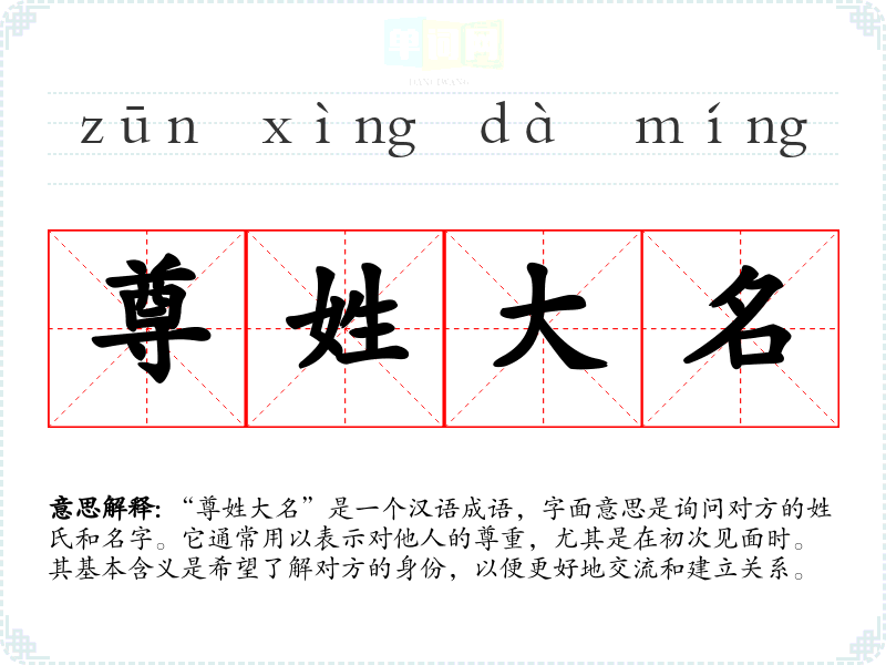 “尊姓大名”是一个汉语成语,字面意思是询问对方的姓氏和名字。它通常用以表示对他人的尊重,尤其是在初次见面时。其基本含义是希望了解对方的身份,以便更好地交流和建立关系。