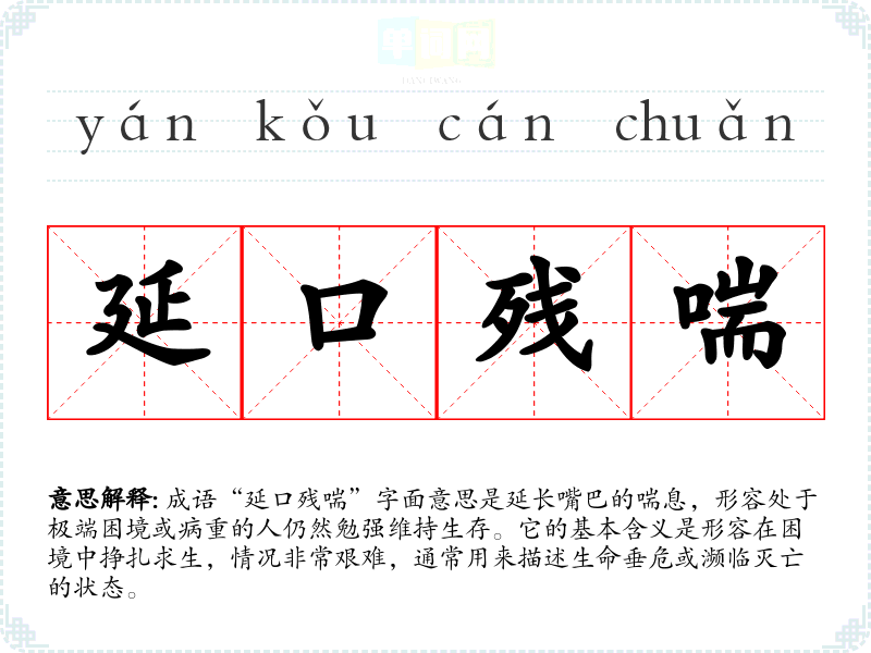 成语“延口残喘”字面意思是延长嘴巴的喘息,形容处于极端困境或病重的人仍然勉强维持生存。它的基本含义是形容在困境中挣扎求生,情况非常艰难,通常用来描述生命垂危或濒临灭亡的状态。